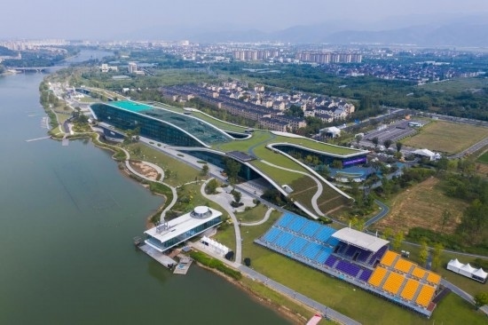 8月24日,空中俯瞰杭州富陽水上運動中心,屋頂被綠植覆蓋。新華社記者 徐昱 攝