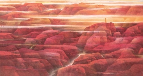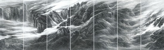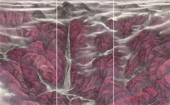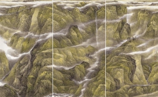 來(lái)自上海并深受海派畫學(xué)影響的樂(lè)震文、張弛,在宋元及明清山水畫學(xué)上打下了深厚的功底,也因此,他們的傳統(tǒng)山水畫深受日本民眾的歡迎。他們?cè)尉訓(xùn)|瀛多年,轉(zhuǎn)道再度研習(xí)了中國(guó)傳統(tǒng)文人畫。但真正改變他們畫風(fēng)的,卻是他們對(duì)中國(guó)北方大山大水的寫生攬勝。他們鐘情于英雄的太行山,忘情于革命勝地陜北高原,力求通過(guò)壯闊雄渾的山巒、連綿逶迤的群峰來(lái)表達(dá)他們的時(shí)代感悟,營(yíng)構(gòu)儲(chǔ)存于他們胸中的山川氣象。所謂“山河回聲”,正是這些作品抒發(fā)的中華民族歷經(jīng)歲月風(fēng)華在大好河山之中回響的奮斗激情。