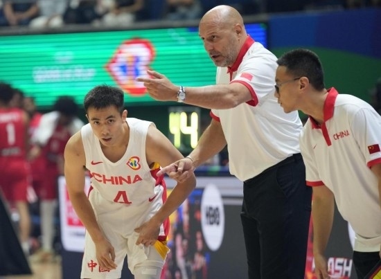 8月30日,中國隊主教練喬爾杰維奇(中)2023年籃球世界杯B組小組賽中指導(dǎo)球員趙繼偉(左)。新華社記者 孟永民 攝