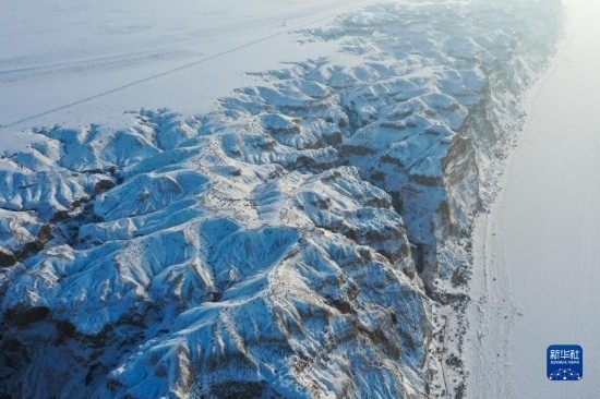 這是在新疆阿勒泰地區(qū)福海縣拍攝的海上魔鬼城冬景(12月21日攝,無人機照片)。