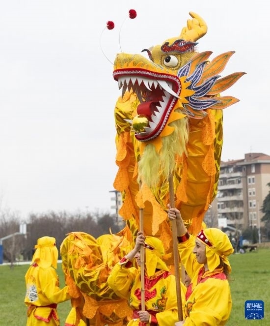 這是2月4日在意大利斯坎迪奇排球俱樂(lè)部主場(chǎng)體育館外拍攝的舞龍表演。新華社記者 李京 攝