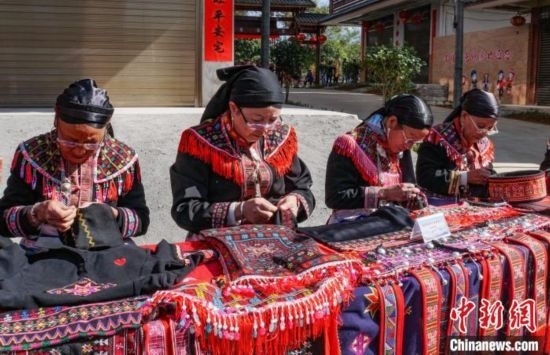 盤(pán)王節(jié)上,瑤族婦女現(xiàn)場(chǎng)展示反面繡技藝。 蔣豐慧 攝
