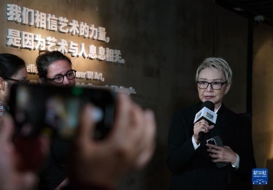3月14日,展覽策展人、上海琉璃藝術(shù)博物館創(chuàng)始人楊惠姍(右)在引導(dǎo)媒體參觀展覽。