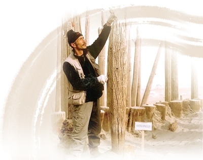 伊弟利斯在考古現(xiàn)場對一個胡楊立柱進(jìn)行測量。