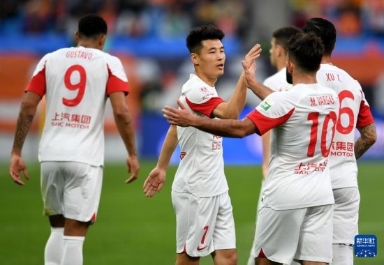 5月1日,上海海港隊球員古斯塔沃(中)在比賽中與隊友慶祝進球。