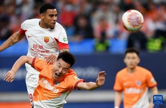 5月1日,上海海港隊球員古斯塔沃(左上)在比賽中與青島海牛隊球員劉佳燊拼搶。