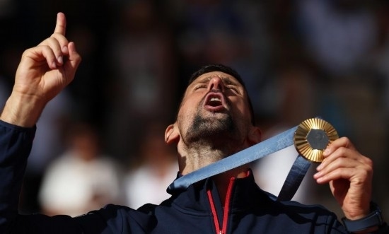 8月4日,焦科維奇在頒獎儀式上慶祝。當日,巴黎奧運會網(wǎng)球項目男單決賽在羅蘭·加洛斯體育場舉行,塞爾維亞選手焦科維奇2比0戰(zhàn)勝西班牙選手阿爾卡拉斯,獲得冠軍。 新華社記者 高靜 攝