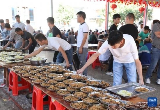 10月5日,在柳州市柳江區(qū)成團(tuán)鎮(zhèn)甘塘村,人們?cè)跍?zhǔn)備重陽(yáng)節(jié)百家宴。