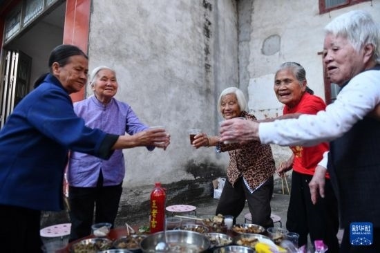 10月6日,在柳州市柳江區(qū)三都鎮(zhèn)白見(jiàn)村,老人們?cè)谥仃?yáng)節(jié)百家宴中共同舉杯。