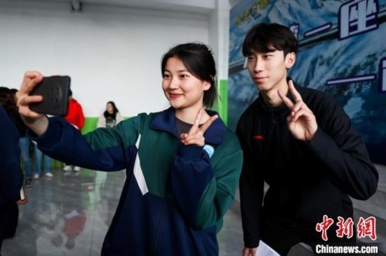 圖為浩門鎮(zhèn)(魯青)高級中學(xué)學(xué)生與梁育帥(右)尋求合照。薛蒂 攝