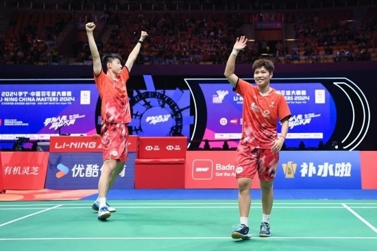 2024李寧·中國羽毛球大師賽24日決出各單項冠軍,國羽組合馮彥哲/黃東萍和劉圣書/譚寧分別奪得混雙、女雙冠軍。