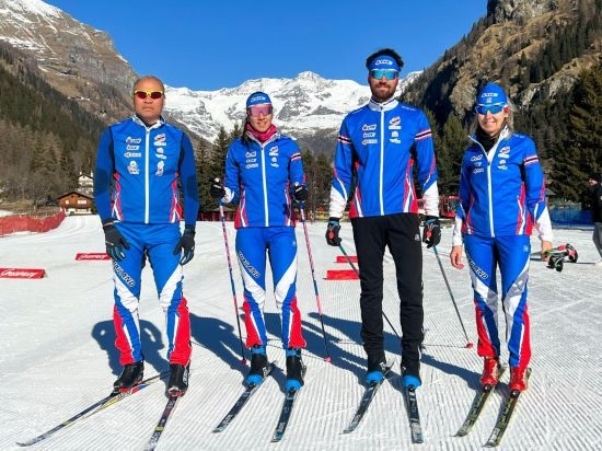 2022年1月24日,泰國越野滑雪隊運動員卡倫·尚隆(左二)、馬克·尚隆(左三)與父母在歐洲備戰(zhàn)訓練時合影。新華社發(fā)(受訪者供圖)