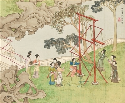 秋千,古稱“千秋”,可追溯至春秋時(shí)期,后改為“秋千”。據(jù)《荊楚歲時(shí)記》記載:“春時(shí)懸長(zhǎng)繩于高木,士女衣彩服坐于其上而推引之,名曰打秋千?!痹诠糯迕鞴?jié)更是有著秋千節(jié)的別稱,可見古人對(duì)春日蕩秋千的喜愛。