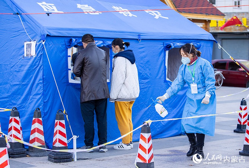 呼和浩特市玉泉區(qū)一處核酸篩查點,黨員志愿者對核酸采樣通道進行消殺。丁根厚攝