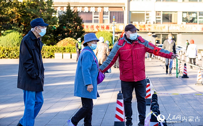 呼和浩特市玉泉區(qū)一處核酸篩查點,工作人員引導老年人通過綠色通道接受核酸檢測。丁根厚攝