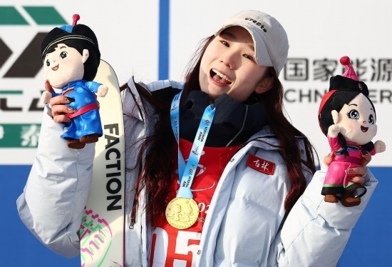 劉夢(mèng)婷的雪板上有一個(gè)“谷”字,她解釋說這是谷愛凌同款定制雪板。“我很喜歡她的風(fēng)格,把她作為我的榜樣,激勵(lì)我進(jìn)步。”