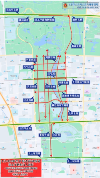 三、14時至開幕式結(jié)束,北辰西路、奧林西路、奧林東路南向北方向主輔路、北辰東路南向北方向主輔路、民族園路,除持有開幕式或冬奧組委核發(fā)的奧林匹克運動會專用證件的車輛和人員外,禁止其他車輛和行人通行。社會車輛和公交車可經(jīng)安立路、安定路、京藏高速公路、北土城西路、北土城東路繞行。