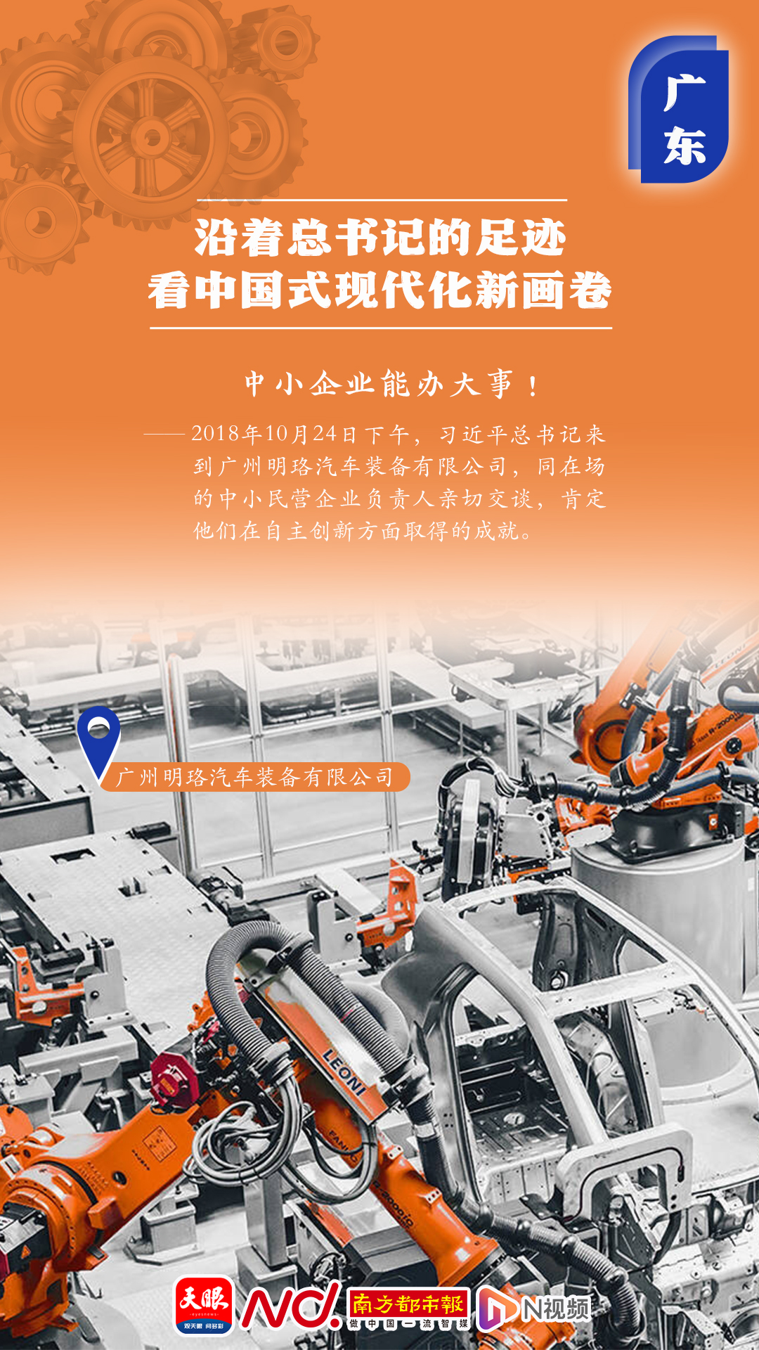 “中小企業(yè)能辦大事!”2018年10月24日下午,習(xí)近平總書記來到廣州明珞汽車裝備有限公司,同在場的中小民營企業(yè)負(fù)責(zé)人親切交談,肯定他們在自主創(chuàng)新方面取得的成就。