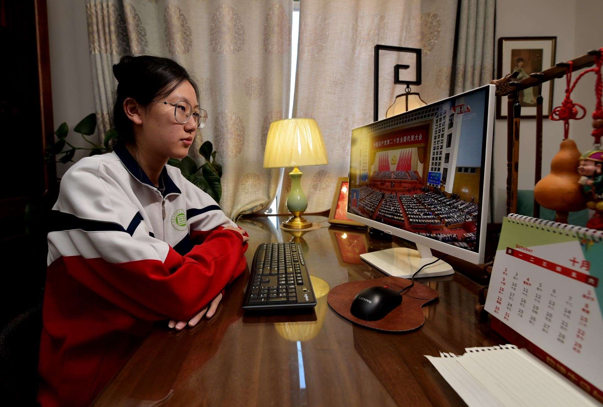 內(nèi)蒙古師范大學(xué)附屬第二中學(xué)的學(xué)生蒙納收看黨的二十大開幕會(huì)。本報(bào)記者馬建荃攝