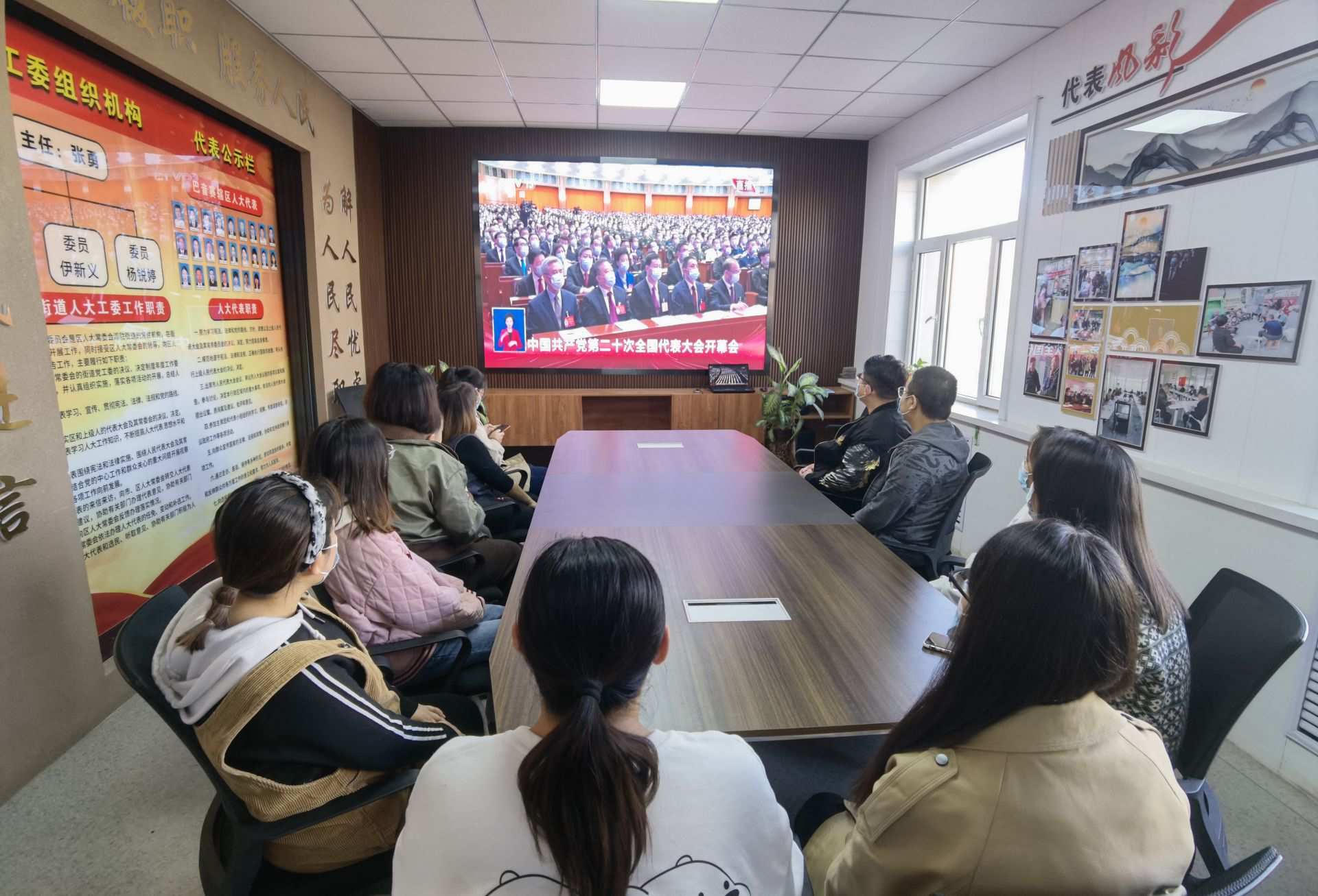 呼和浩特市大學(xué)東路街道工作人員線上收看黨的二十大開幕會(huì)。黃麗杰攝