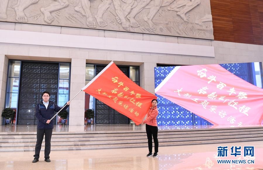 1月18日,在北京國家博物館,記者代表展示“奮斗百年路 啟航新征程”大型主題采訪活動旗幟。新華社記者 申宏 攝